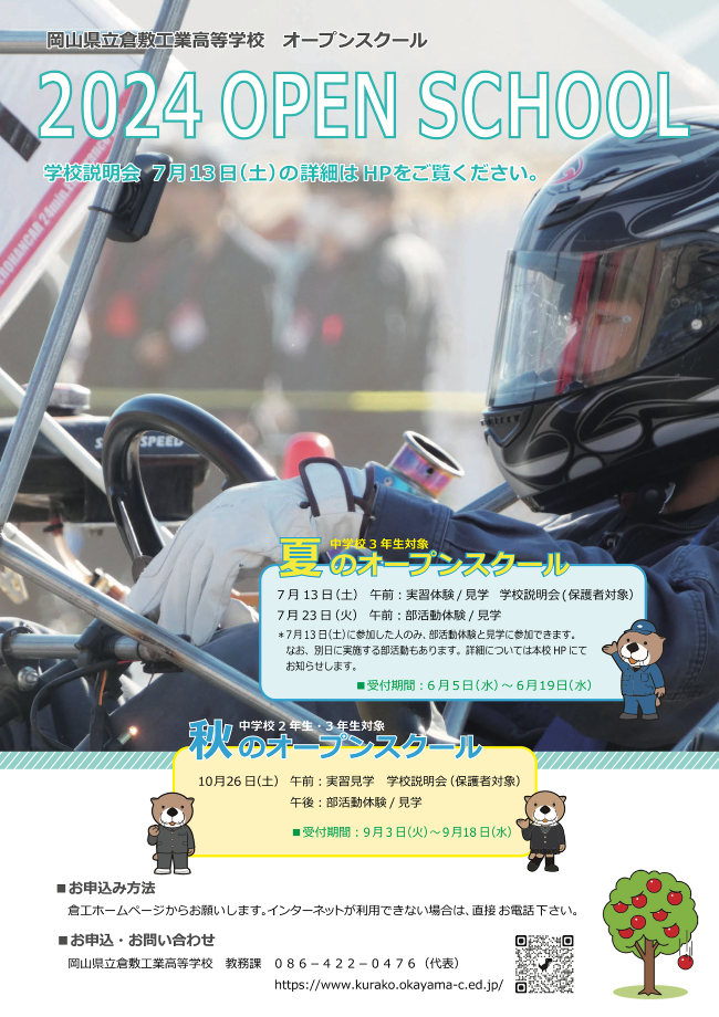 岡山県下に特別警報または倉敷市に暴風を伴う警報または大雨警報が発令になった場合,オープンスクールの実習体験/見学を中止します。なお、予備日はありません。