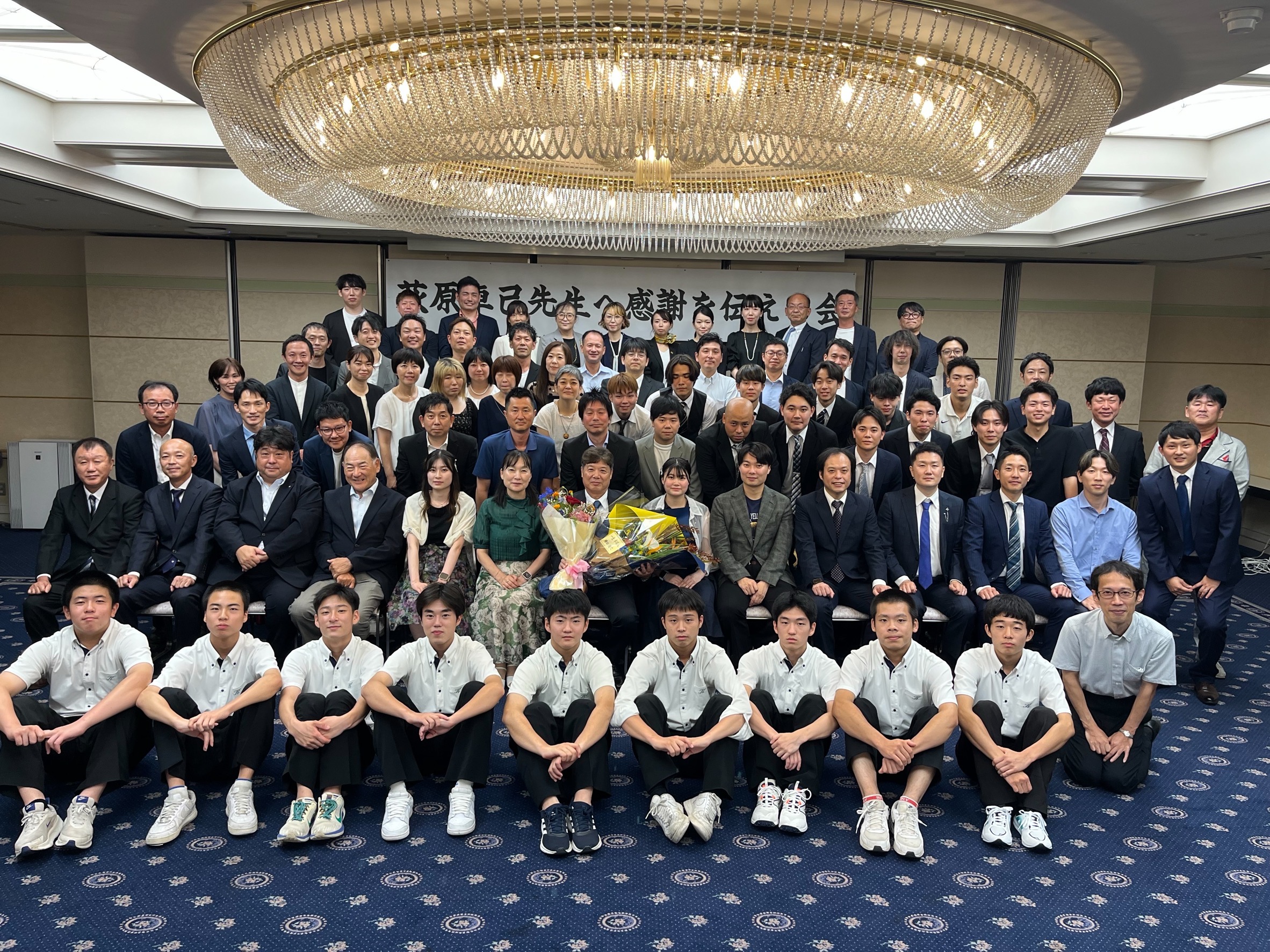 本校卓球部監督 萩原卓己先生が昨年度末で、定年退職を迎えられ一区切りとなりました。しかし本校には萩原先生が必要不可欠なため、再任用という形でまだ勤務はされていますが、長年にわたり教育に尽力され、多くの生徒・学生に学びと気づきを与えてくださった先生へ、少しでも感謝の気持ちを伝えたいという思いから、この会が卒業生により企画されました。会場には玉野光南・倉敷工業の教え子が県外からも含め総勢100名集まり、思い出話に花を咲かせながら、先生とのこれまでの歩みを振り返りました。先生も、懐かしいエピソードを交えながら笑顔でお話くださり、会場は終始あたたかな雰囲気に包まれていました。今後も萩原先生には「生涯卓球人」として現場で指導していただき、これまでのOB同様に後輩たちにも大きな夢と希望と愛情を今後も与え続けてください。